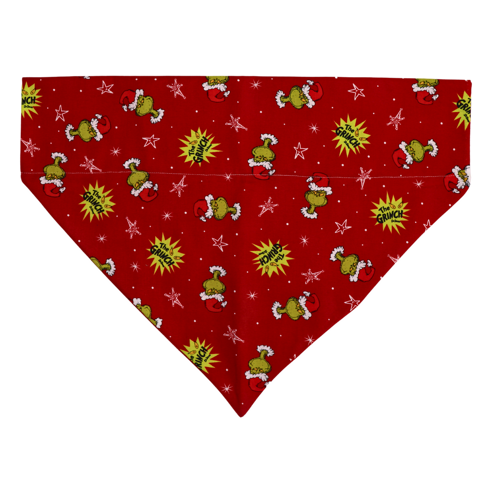 Bring the whimsical magic of Whoville to your pet’s holiday wardrobe! This vibrant red bandana features the mischievous yet lovable Grinch in his Santa costume, surrounded by cheerful Christmas stars and the iconic title of the beloved holiday classic. Perfect for festive gatherings, holiday photos, or cozy evenings by the tree, this bandana lets your furry friend join in the holiday spirit with a touch of Grinchy charm. Whether your pet is stealing hearts or holiday snacks, they’ll look paws-itively adorable in this seasonal favorite!